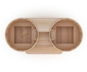 Двойная купель из кедра чаще всего используется в крупных банных комплексах и оздоровительных центрах. Она представляет собой две круглые чаши для воды, в которых люди отдыхают после парения. Между купелями установлен широкий подиум из кедра, по которому могут спускаться и подниматься сразу несколько людей. Для комфортного отдыха купель оснащена лавочками и двумя дополнительными лестницами. За счет стяжных болтов обручи из нержавеющей стали плотно прилегают к кедровой купели. Это позволяет равномерно распределять нагрузку воды и сохранить форму изделия в период эксплуатации. При правильном уходе купель для бани не рассыхается и не подвергается гниению.