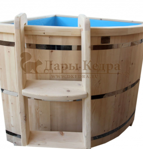 Это треугольная емкость для воды с пластиковой чашей. Она предназначена для отдыха и охлаждения тела после банных процедур. Купель устанавливается в угол помещения, что идеально для не больших пространств. Так же подходит для уличного использования. Угловая купель с пластиковой вставкой оснащена лавочками, приставной и внутренней лестницей из кедра.