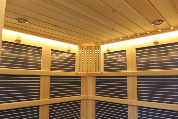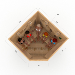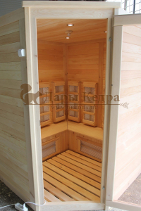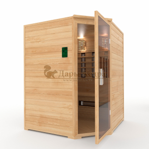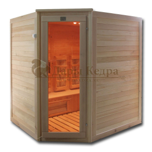 Это специально оборудованная кедровая кабина для прогрева тела человека сухим теплом. Воздух в таких парных не нагревается. Инфракрасные лучи воздействуют на тело, равномерно прогревая мышцы, суставы и органы. Керамические излучатели похожи на лампы, имеют высокую температуру нагрева, поэтому защищены противоожоговыми решетками. Тело человека в таких саунах нагревается интенсивнее. Работает кабина за счет электричества. Установка сауны в угол, позволяет рационально использовать пространство помещения. Эта вместительная модель подходит для коммерции.